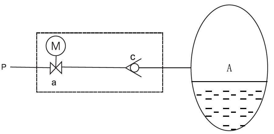 簡(jiǎn)易型自動(dòng)補(bǔ)氣裝置:工作原理如下圖所示,當(dāng)自動(dòng)補(bǔ)氣條件滿足時(shí),電動(dòng)球閥得令通電,高壓氣通過(guò)電動(dòng)球閥a、單向閥c補(bǔ)氣。此時(shí)閥位指向開(kāi)啟位置,同時(shí)位置開(kāi)關(guān)輸出補(bǔ)氣信號(hào)。建議采用PLC間歇補(bǔ)氣,防止補(bǔ)氣過(guò)量。電動(dòng)球閥帶手動(dòng)裝置,失電時(shí)可實(shí)現(xiàn)手動(dòng)操作。